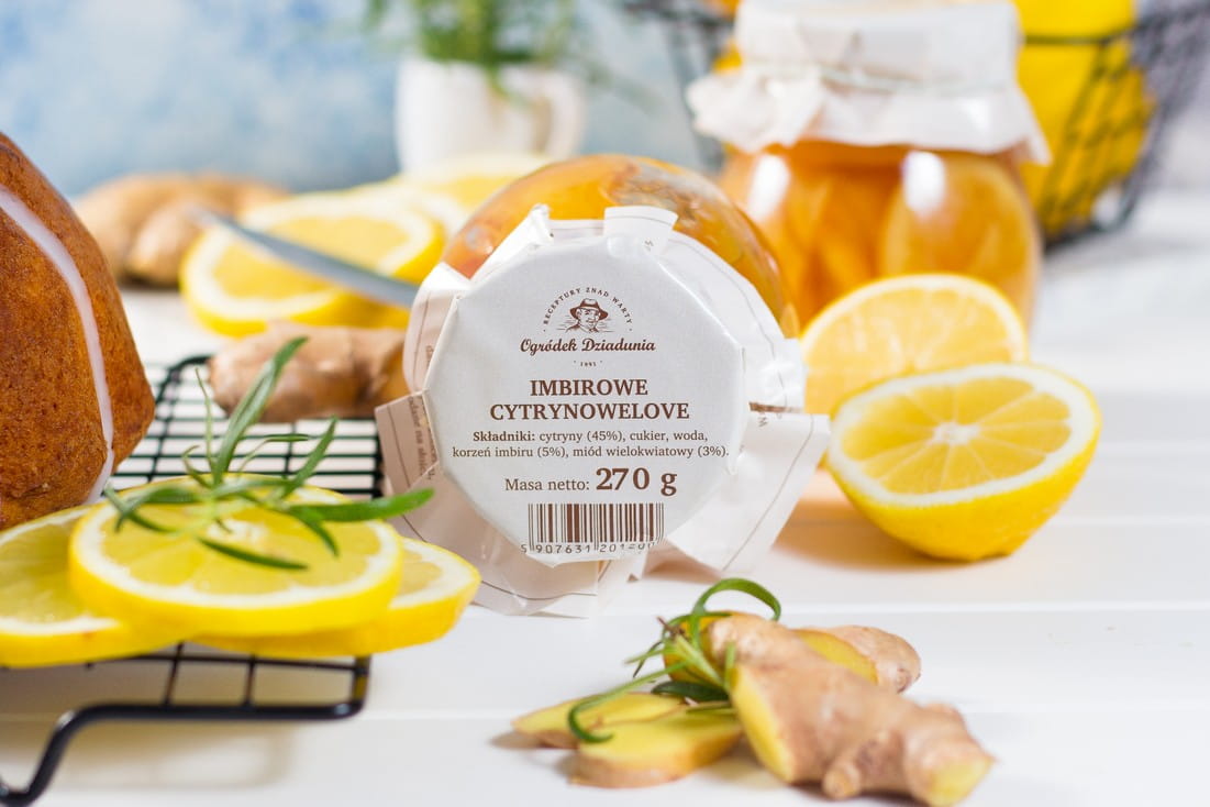 Składniki: cytryny (45%), cukier, woda, korzeń imbiru (5%), miód wielokwiatowy (3%)