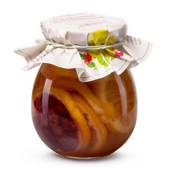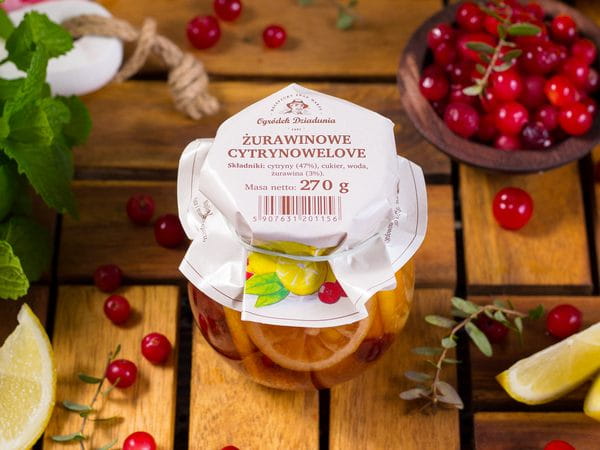 Plastry cytryny zanurzone w słodkim syropie z dodatkiem owoców żurawiny. Intensywny aromat cytryn w połączeniu z delikatną żurawiną tworzą idealny duet smakowy. Będą świetnym dodatkiem do wody lub herbaty. Klasyczny wygląd słoiczka sprawia, że możesz je także podarować jako prezent dla bliskiej osoby.