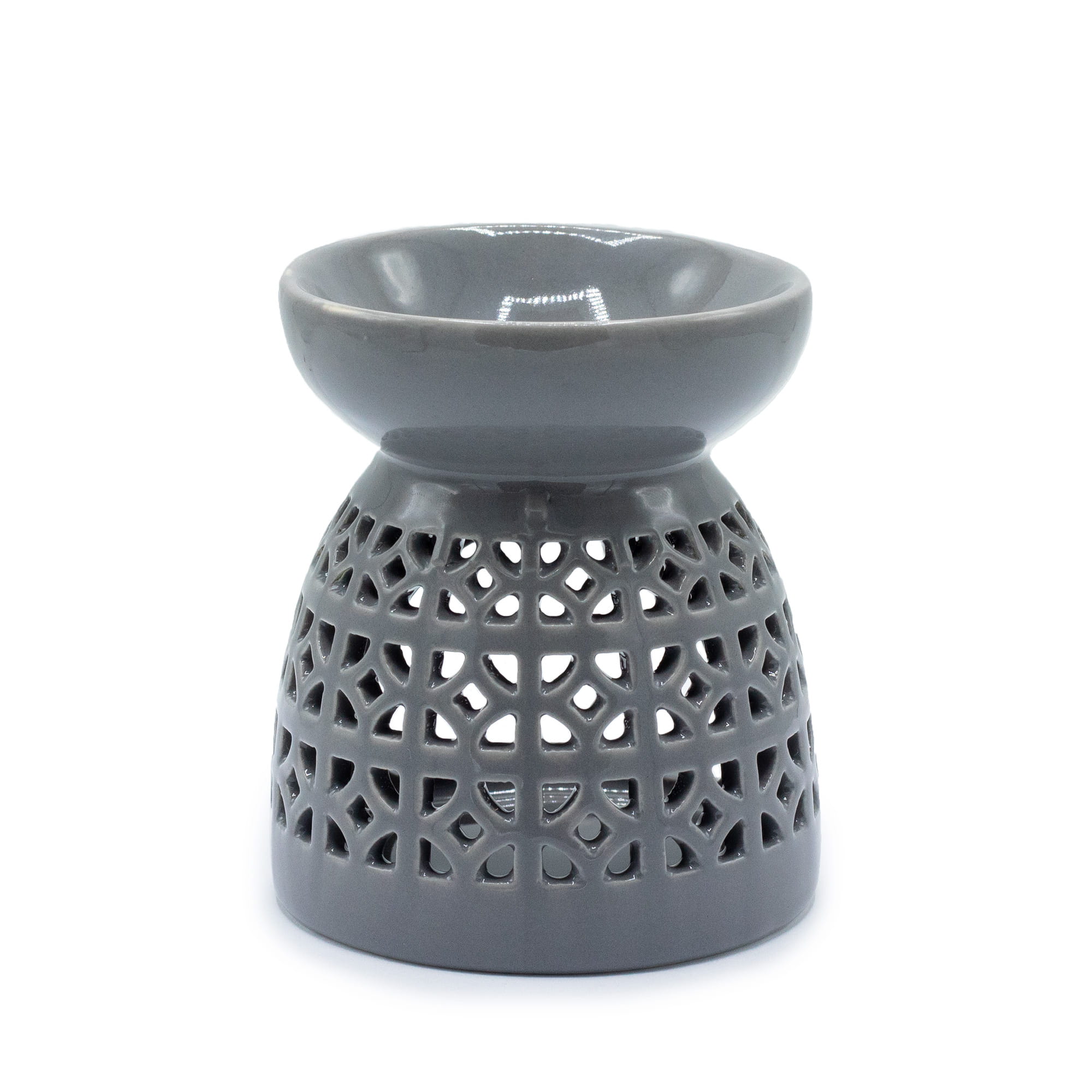 Elegancki kominek zapachowy inspirowany marokańskimi wzorami, wykonany z wysokiej jakości szarej ceramiki. Precyzyjne, geometryczne wycięcia nadają mu unikalnego stylu, tworząc piękny efekt świetlny, gdy umieścisz wewnątrz świeczkę.