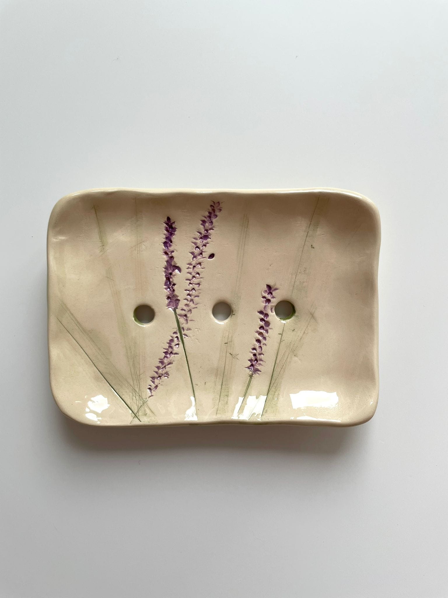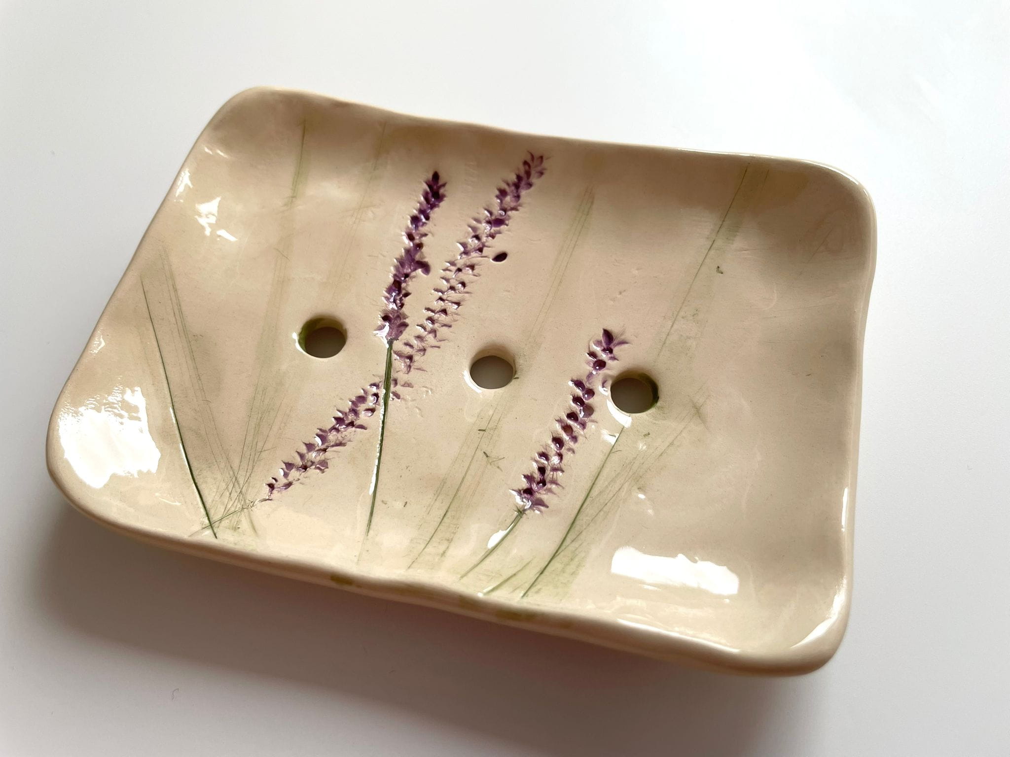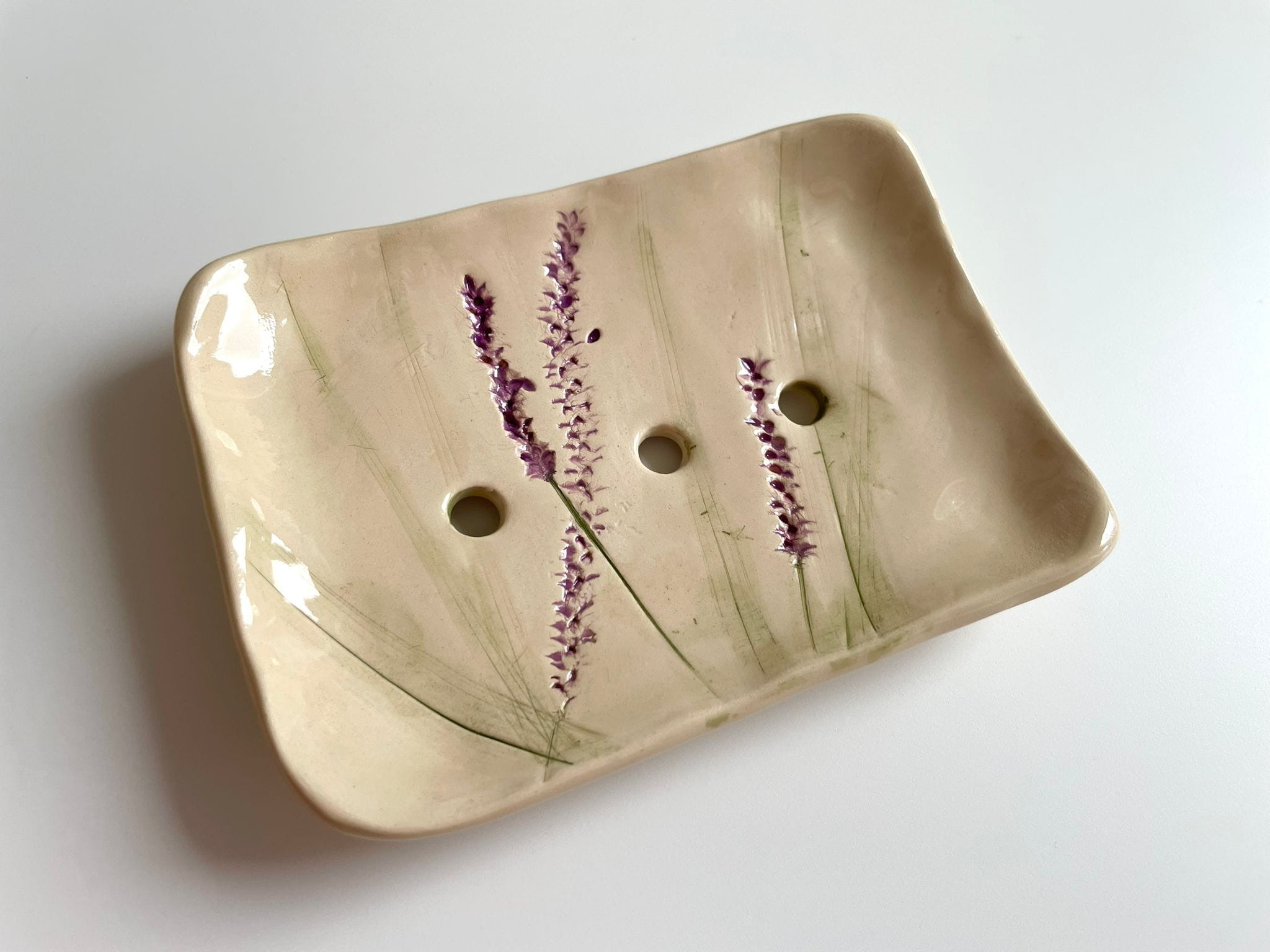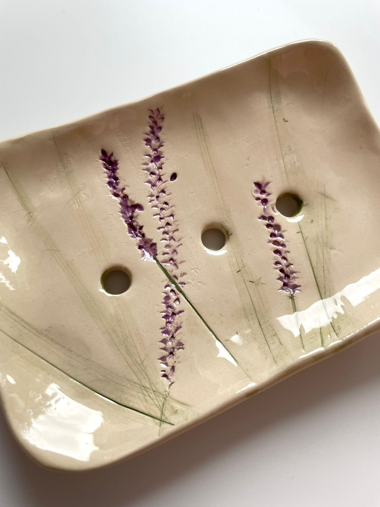 Piękna mydelniczka "Wrzosowa polana", wykonana ręcznie z gliny.