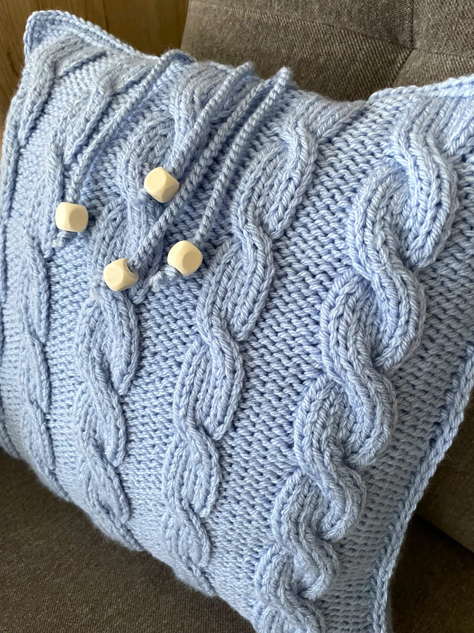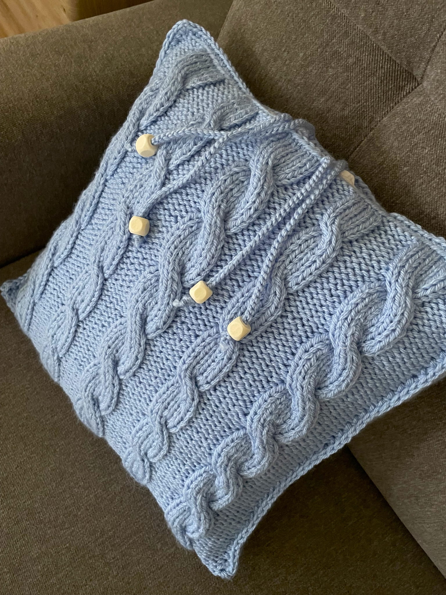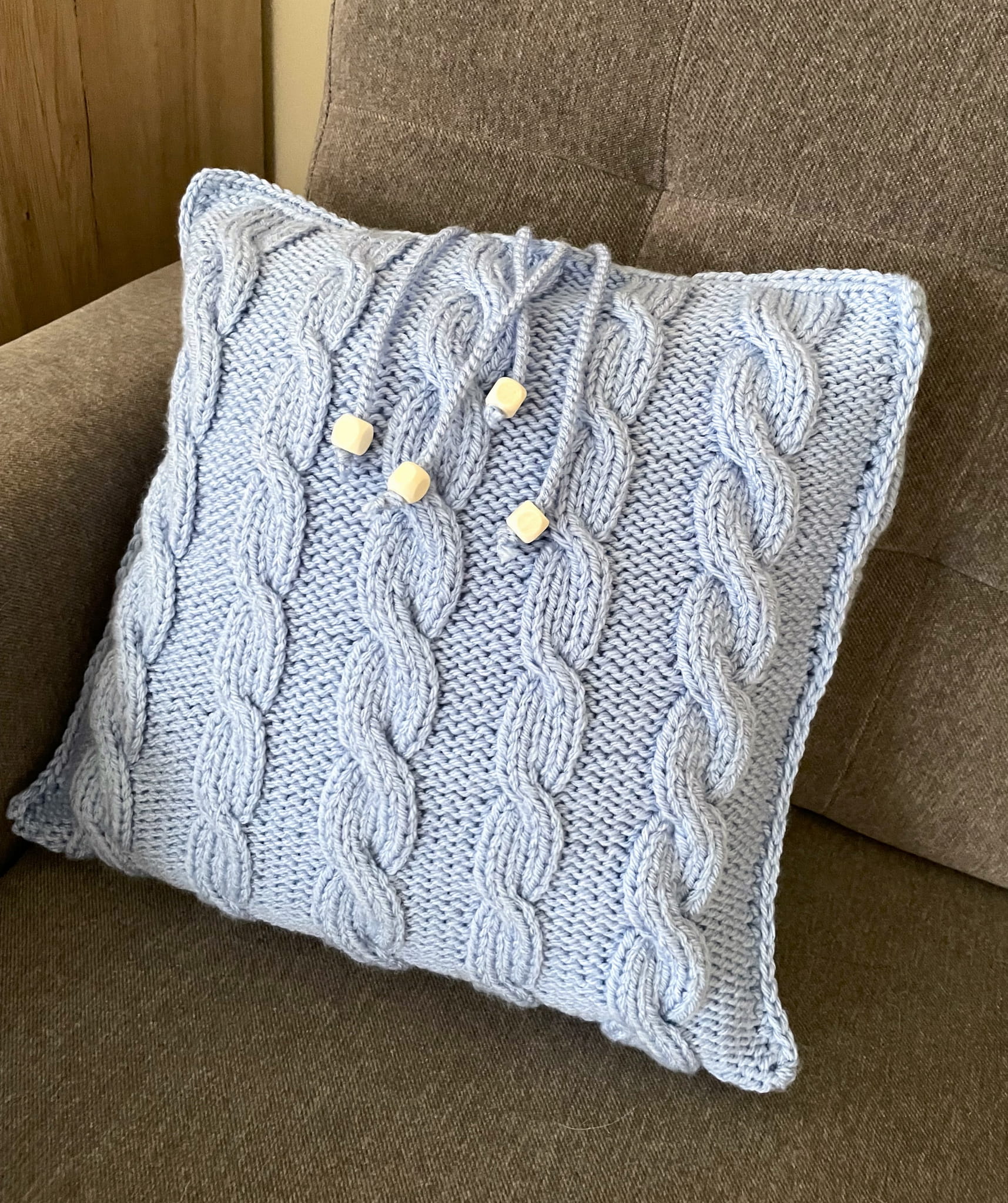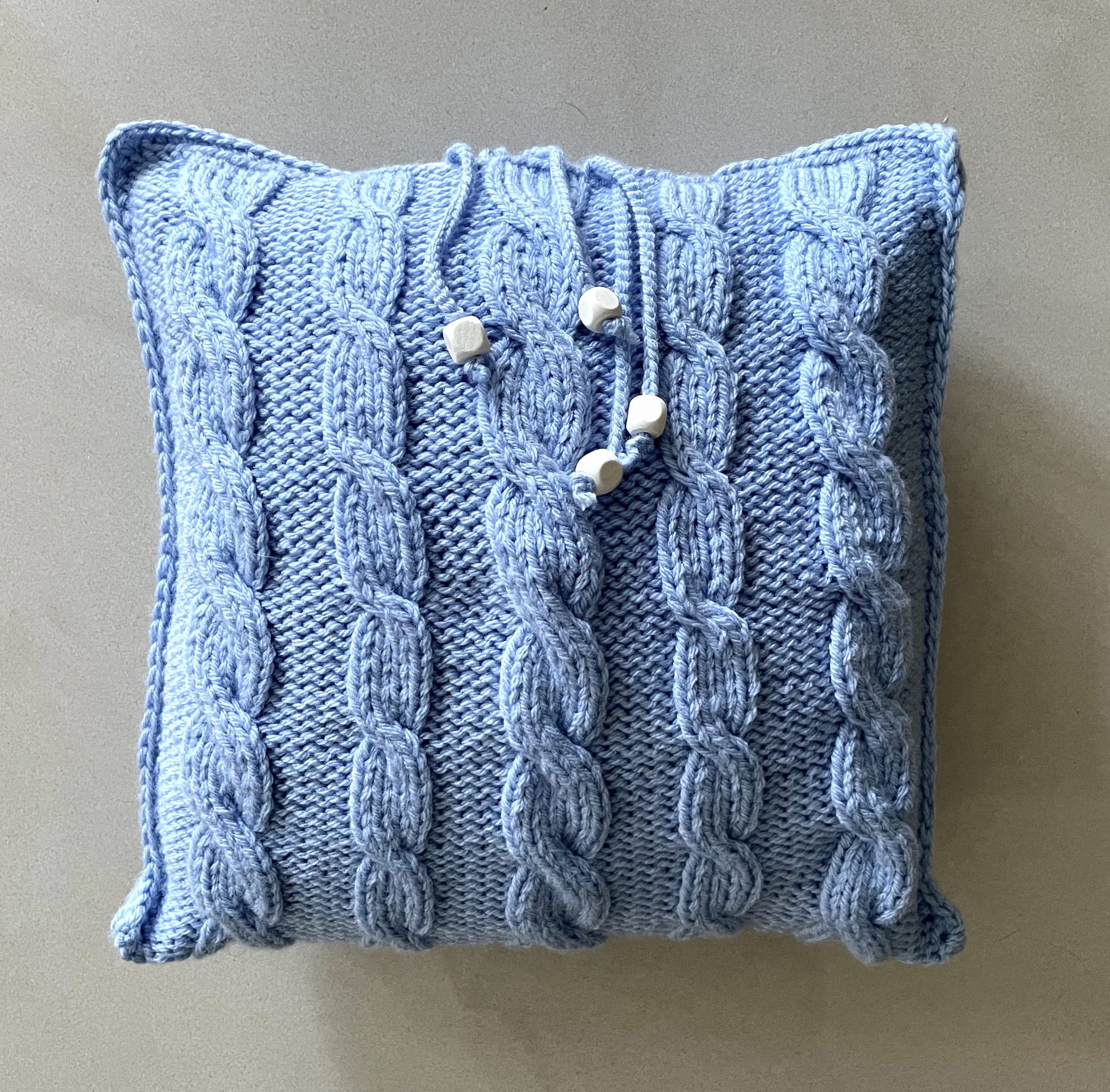 Poszewka na poduszkę w kolorze baby blue, wykonana na drutach