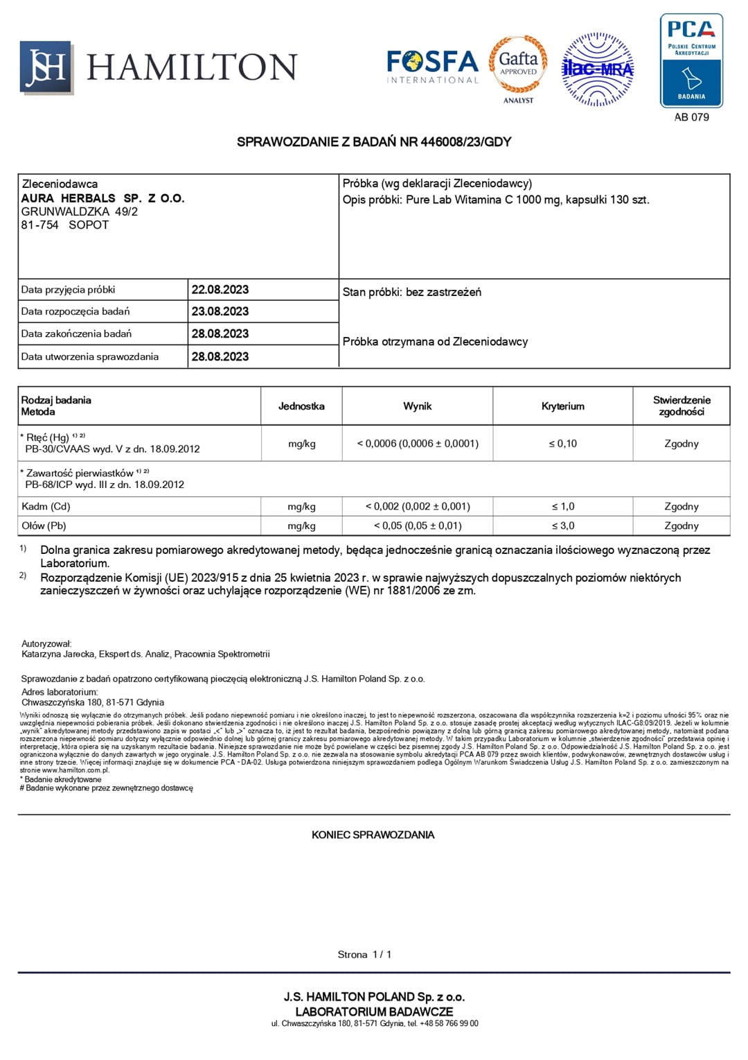 Produkt został przebadany w niezależnej jednostce laboratoryjnej w celu zagwarantowania najwyższej jakości i bezpieczeństwa stosowania suplementu diety.