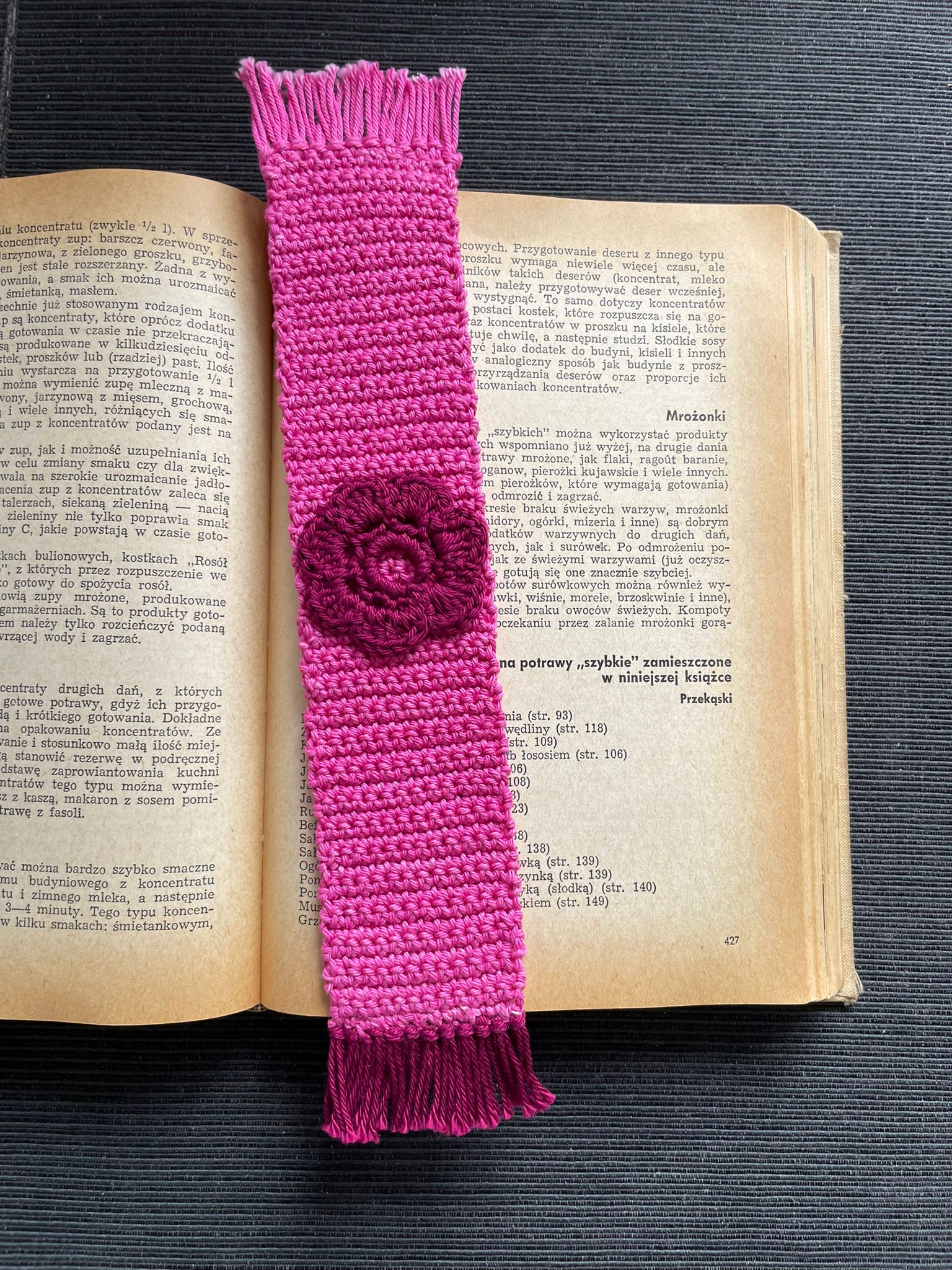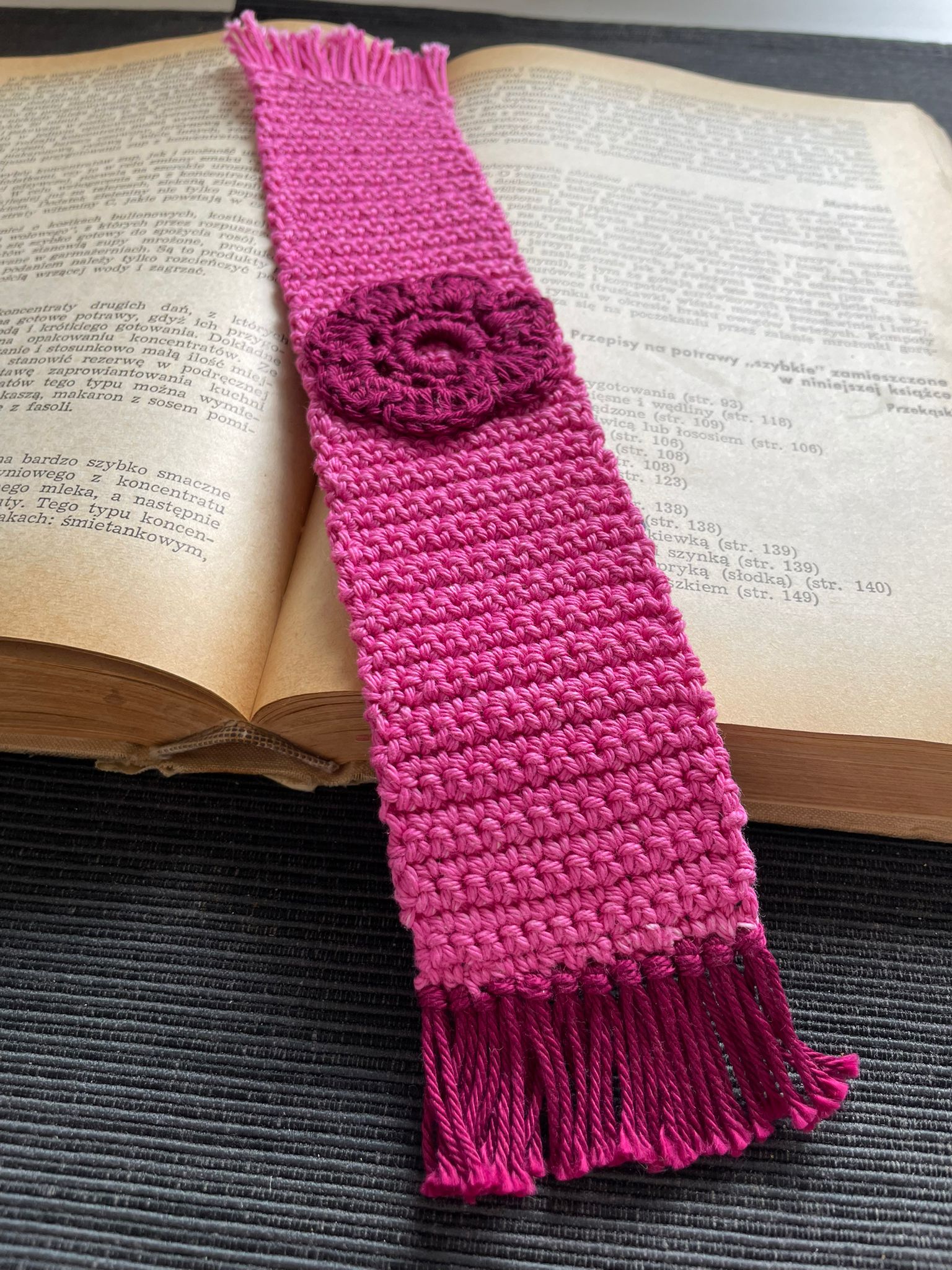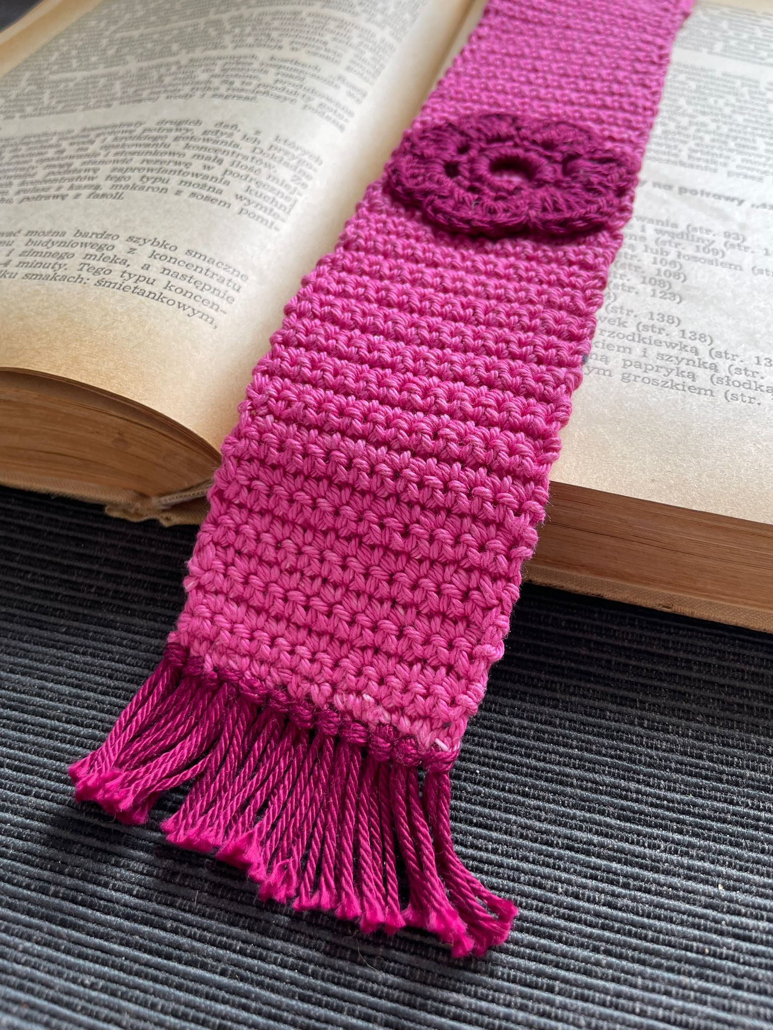 Urocza zakładka do książki wykonana z bawełnianego sznurka w kolorze różowym przez naszego zaprzyjaźnionego Rękodzielnika :)